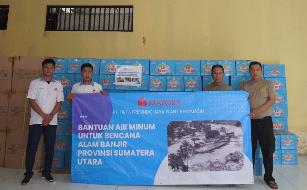 HARIANBANYUASIN.COM — PT Tirta Fresindo Jaya Plant Banyuasin, yang merupakan bagian dari Mayora Group, menyalurkan bantuan air mineral 'Le Minerale' bagi masyarakat terdampak bencana di Sumatera Utara.