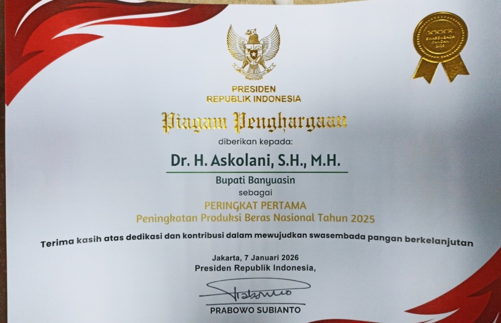 Tak hanya menerima Satyalencana Wira Karya, Bupati Banyuasin yang menjabat dua periode ini juga memperoleh piagam penghargaan dari Presiden Prabowo Subianto sebagai peringkat pertama peningkatan produksi beras nasional tahun 2025.
